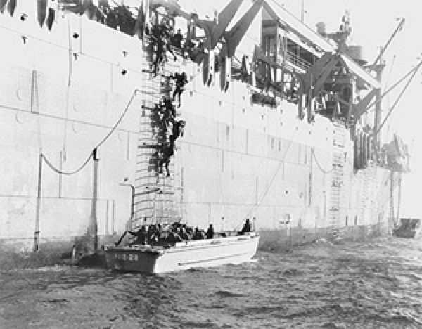The USS General Brooke, serving as the flagship vessel with the 410th on board, left New York Harbor, passing the Statue of Liberty, and sailed 15 days along with 14 other naval and commercially re-designed ships to transport U.S. troops across the stormy Atlantic to the eastern front of the Allied war with Germany. The landing and unloading of troops and supplies at Catalans Beach (sometimes referred to historically as Callahan’s Beach) was chaotic. Troops disembarked the Brooke via rope ladders to Landing Craft Infantry (LCI’s)