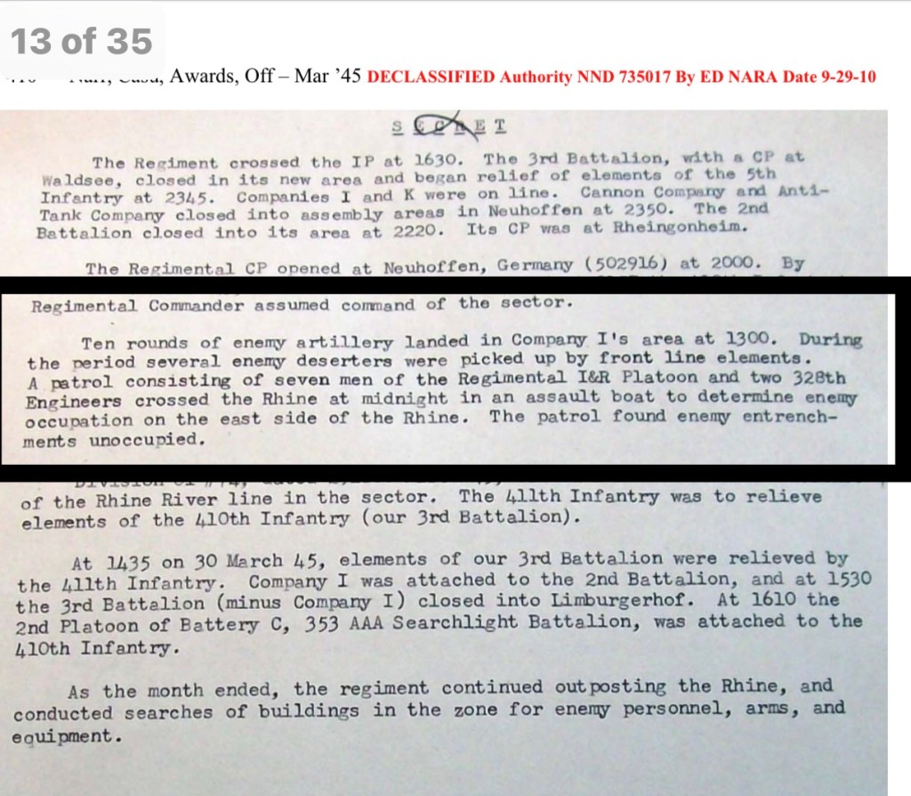 While the details of all he experienced are still thin, his journey into the Vosges Mountains, Alsace- Lorraine, the extraordinary December through March offensive driving the Germans back to Germany, playing a role in the liberation of France and the midnight crossing of the Rhine and throughout his tour leading recon patrols in the darkness to make unknowns known.