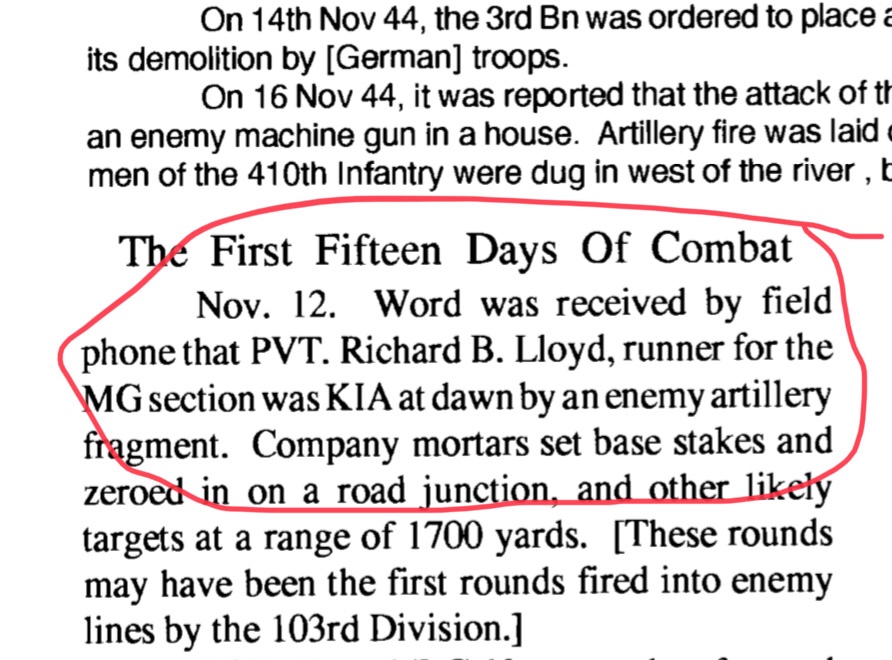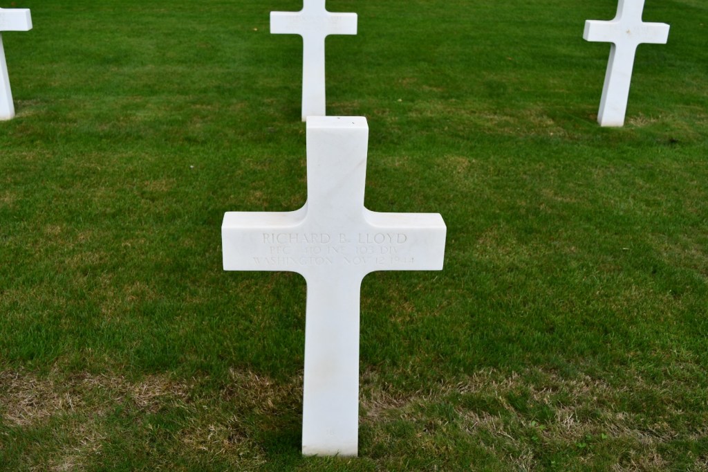 I continue to walk among the graves as the skies began to darken. I slowly worked my way toward the start of Section B of the cemetery, once again, saying names aloud and taking note of dates, home states and regimental affiliation. The last one I came upon was the cross of Pfc. Richard B. Lloyd of the 410th – from Washington state killed in action on Nov. 12, 1944. I touched the stone, said a prayer and thanked him for his service. Two days into combat.
