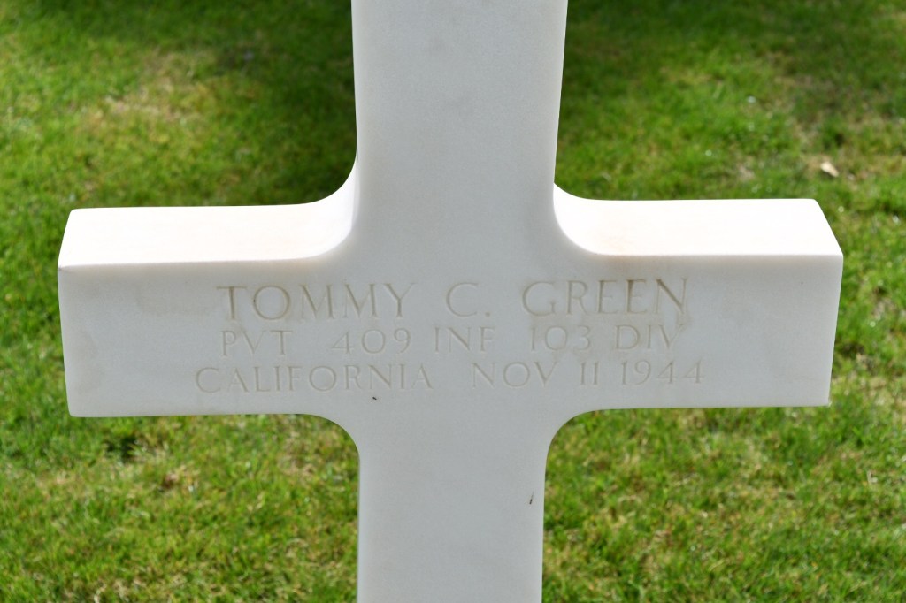 Pvt. Tommy Green died Nov.11, 1944, the first full day of combat after arrival in Docelles. Pvt. Domingo Hernandez, Nov 16th – both from the 409th Regiment. Pfc Bert L. Overcash Jr.410th on November 27. Brothers buried next to each other. Jean Cunningham, American Red Cross worker. Crosses marked with an unknown name labeled “A comrade in arms”