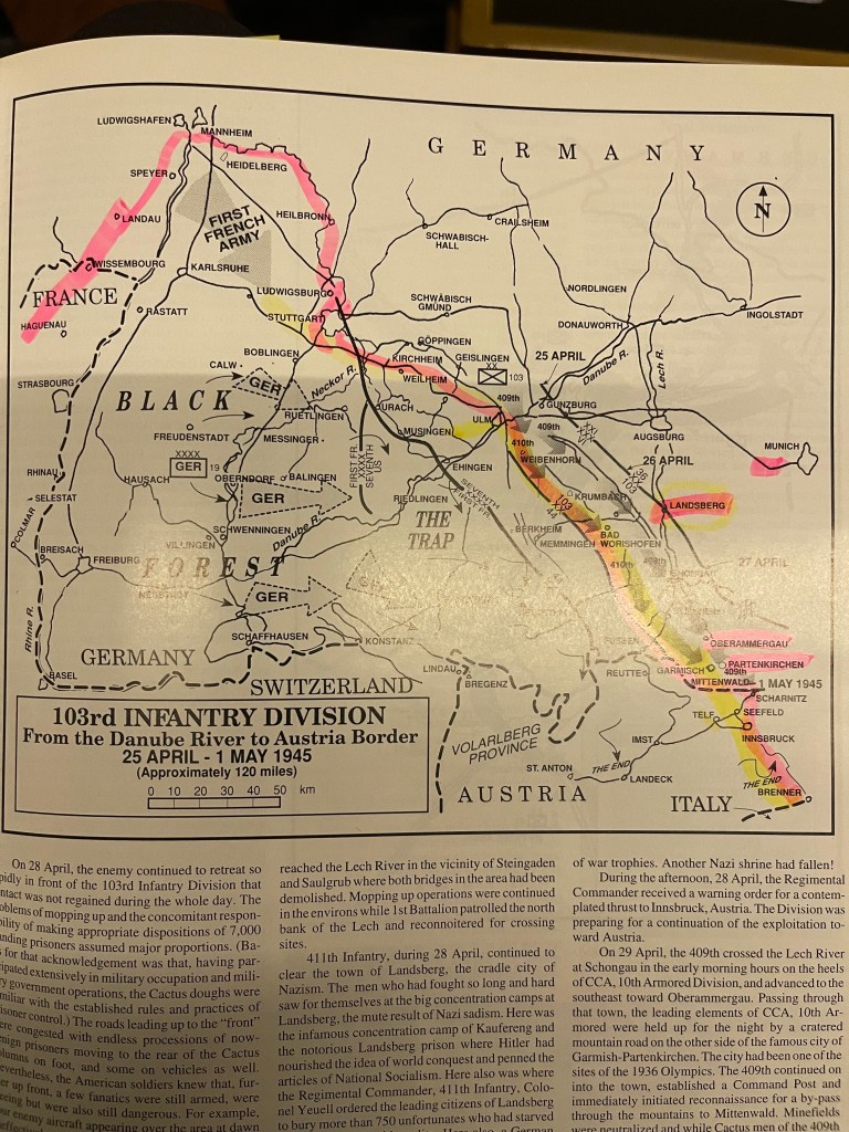 The 103d Infantry Division arrived at Marseilles, France, 20 October 1944. It relieved .the 3d Division at Chevry, 8 November, and attacked west of St. Die, 16 November, in its drive through the Vosges Mountains. Meeting heavy resistance all the way, it crossed the Meurthe River, took St. Die, 23 November and captured Diefenbach on 29 November and Selestat on 4 December. The Division crossed the Zintzel River at Griesbach, 10 December. Pushing through Glimbach, the 103d crossed the Lauter River into Germany, 15 December, and assaulted the outer defenses of the Siegfried Line. On the 22d, the Division moved west to the Sarreguemines area where an active defense was maintained. The enemy offensive did not develop in its sector and the 103d moved to Reichshofen, 14 January 1945, to take up positions along the Saner River. Defensive patrols were active and a limited attack on Soufflenheim on the 19th was repulsed by the enemy. On the 20th, the Division withdrew to the Moder and repulsed German advances near Muhlhausen, 23-25 January. The 103d’s offensive began, 15 March 1945. Crossing the Moder and Zintzel Rivers and taking Muhlhausen against sharp opposition, the Division moved over the Lauter River and penetrated the defenses of the Siegfried Line. As German resistance disintegrated, the 103d reached the Rhine Valley, 23 March, and engaged in mopping up operations in the plain west of the Rhine River. In April it received occupational duties until 20 April when it resumed the offensive, pursuing a fleeing enemy through Stuttgart and taking Munsinger on the 24th. Crossing the Danube near Ulm on the 26th, it took Innsbruck on 3 May and reached the Brenner Pass on the 4th. After VE-day the Division received occupational duties until it left for home and inactivation. From US Army Center of Military History https://history.army.mil/index.html
