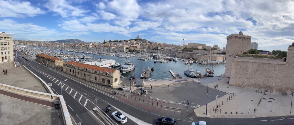 Customs and car rental went surprisingly smoothly. Drove my 6 speed stick shift Fiat into Marseille. Knowing my hotel was in the city center I had inquired about parking. Figured I’d drive to the hotel and unload my bags. No chance, as I found myself feeling like I was in a Jason Bourne movie driving though throngs of people and endless motorcycles weaving in, out and around traffic. Finally found a parking garage and put the car away for my three day stay.My hotel, Hôtel Saint Louis – Vieux Port, overlooked the public plaza Cours Saint-Louis a few block from the Old Port harbor.