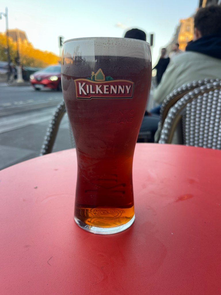 Made my way outside, and placed the draught Kilkenny Red on table. My order was somewhat prompted by past times of ordering a Killeen Red Ale. I first became acquainted with red ale from my Dad at The Winooski Waterworks in Colchester when we were both living in VT. He’d often order if available. I lifted the glass and paused. I placed it back on the table, took a picture, and then raised the glass and toasted the Big Guy. Where would a better moment be than a blue sky sunset at an Irish pub in Paris on the next to last night of my travels celebrating Dad’s combat experience.